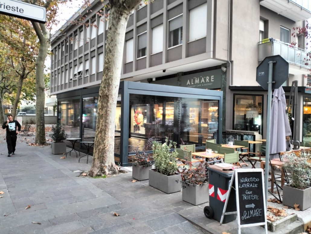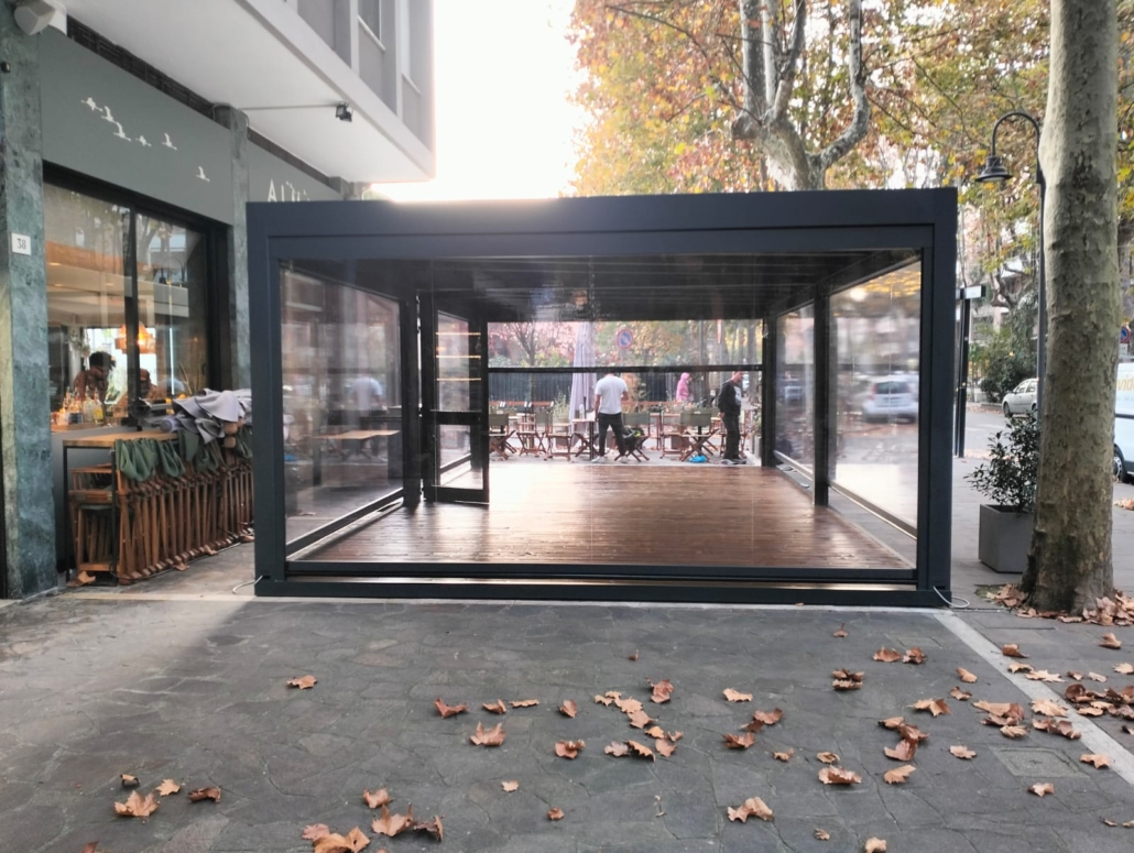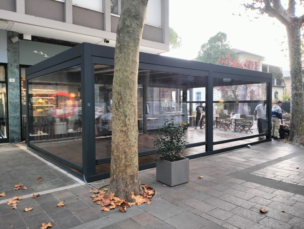 Il progetto nasce dall’esigenza di rendere lo spazio esterno pienamente fruibile anche durante l’inverno, mantenendo al tempo stesso una totale apertura visiva e una perfetta integrazione con il contesto urbano e lo stile innovativo del locale.