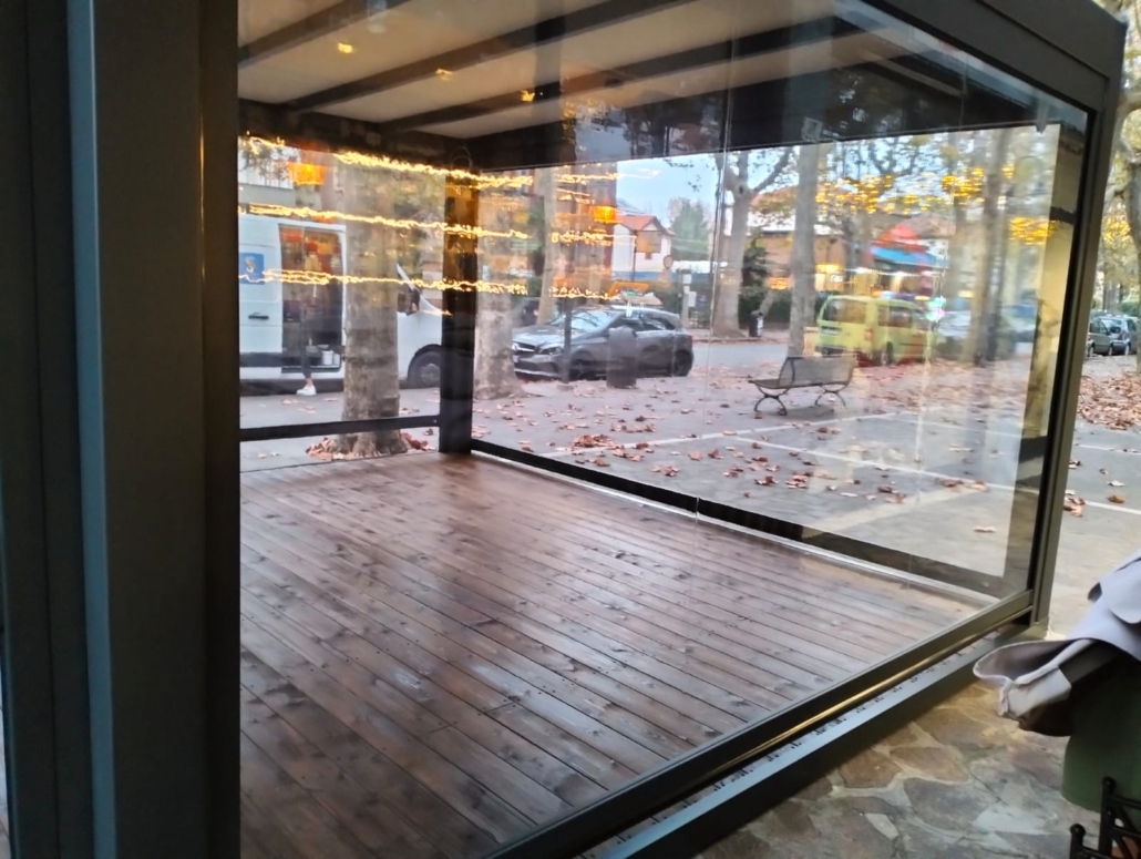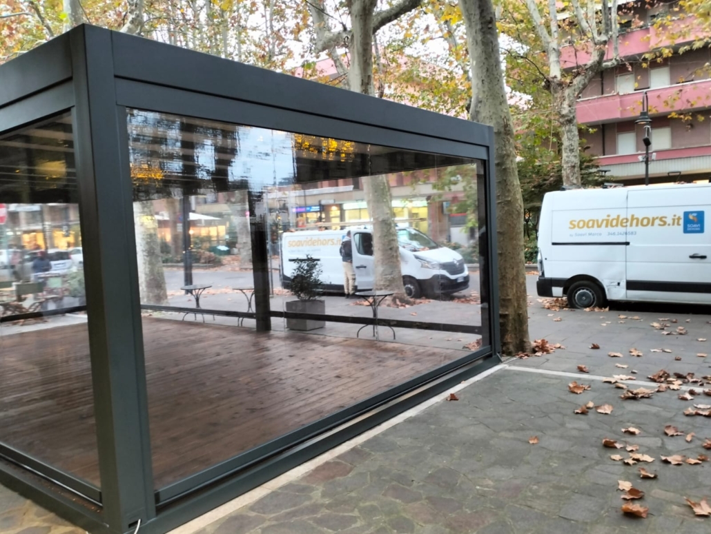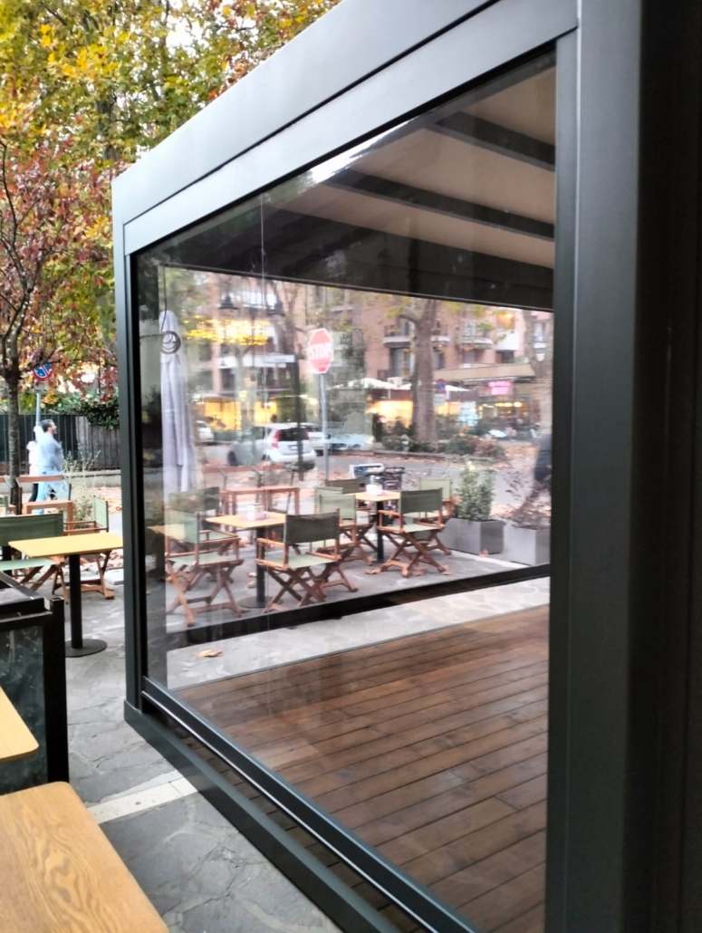 A completamento del progetto sono stati installati tamponamenti laterali con tende saliscendi in Crystal trasparente di ultima generazione, che garantiscono protezione dagli agenti atmosferici senza rinunciare alla luminosità e alla visibilità verso l’esterno. Il risultato è un dehors totalmente modulabile, capace di adattarsi alle diverse condizioni climatiche e alle esigenze del locale.