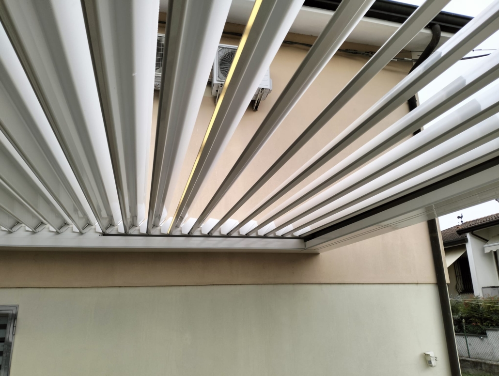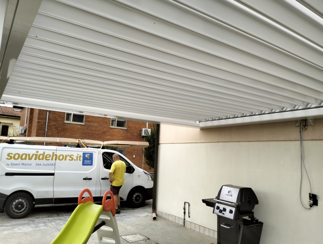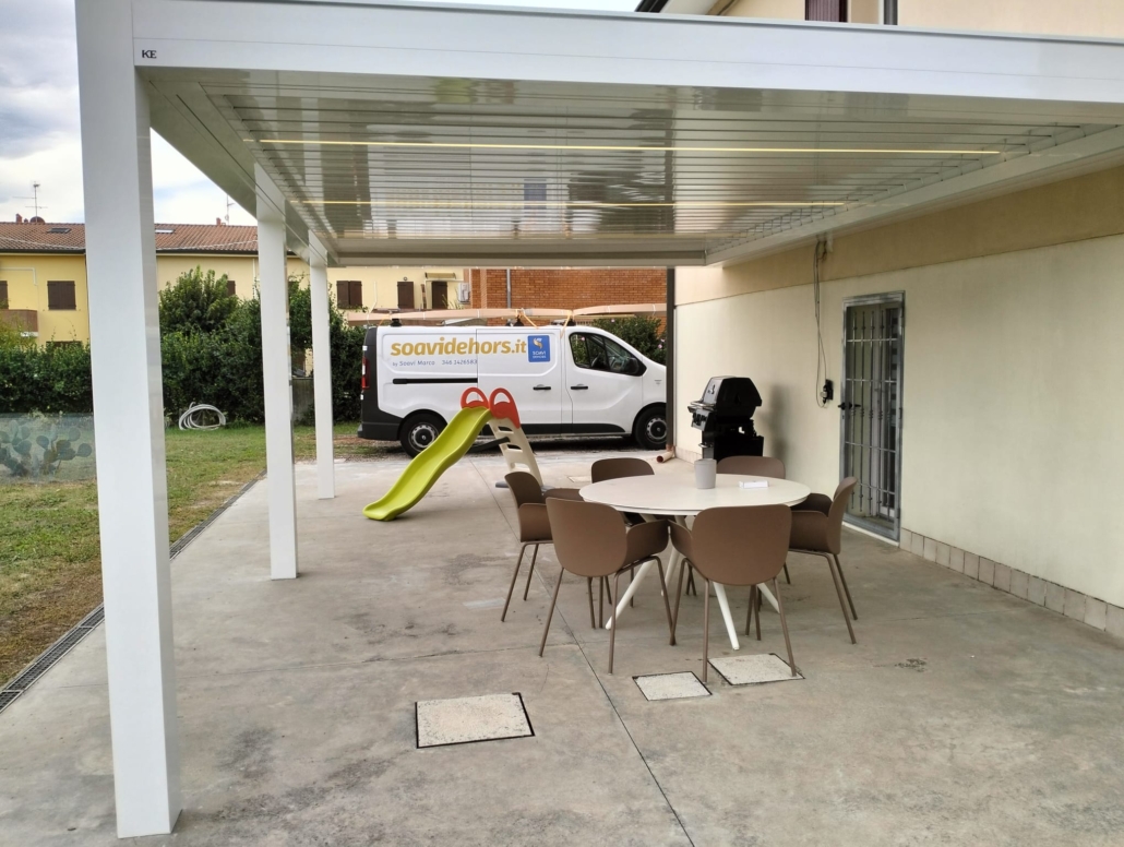 Questa struttura rappresenta il massimo in termini di prestazioni di schermatura solare e protezione dalla pioggia, garantendo un ambiente esterno vivibile in ogni condizione climatica.