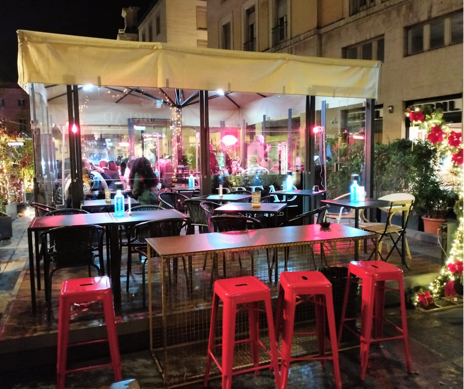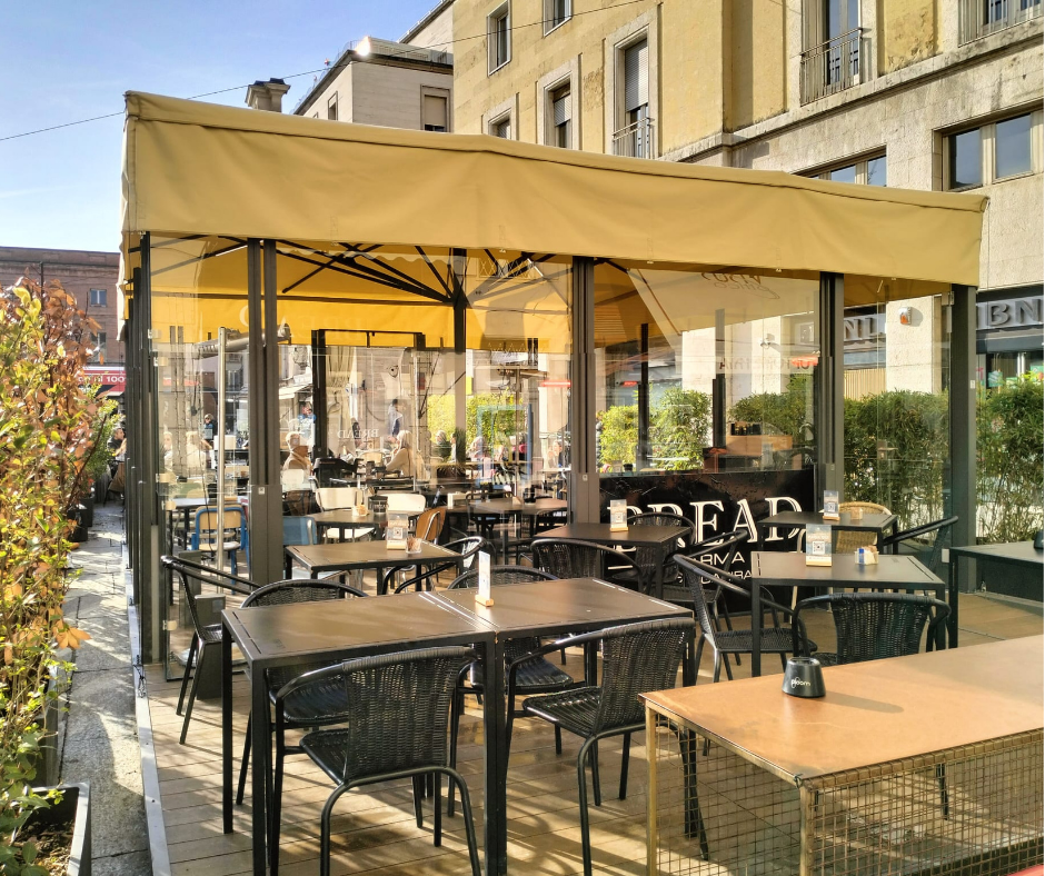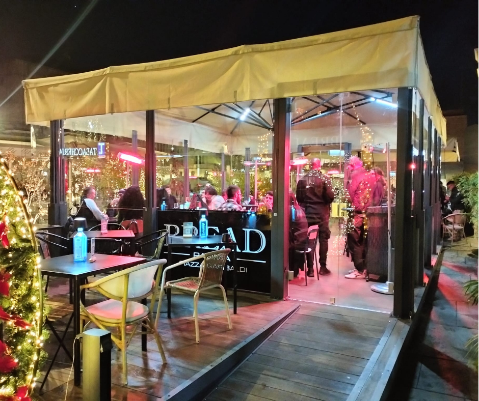 Particolare attenzione è stata dedicata all’illuminazione, studiata per valorizzare il dehors anche nelle ore serali e creare un ambiente accogliente e coerente con lo stile contemporaneo del locale. A completare il progetto, l’installazione dei paraventi modello Pareo Up, dotati di tre pannelli vetrati saliscendi automatici, che consentono una gestione flessibile degli spazi in base alle condizioni climatiche.